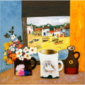 マグカップに描かれた3羽の可愛いアヒルと、窓の外に広がるのどかな英国の港町。イギリスの女性作家、ブレンダ・キングならではの、室内と屋外を同時に描くユニークな構図が魅力の作品です。